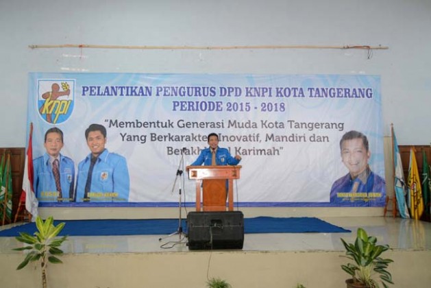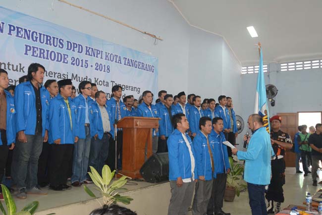 Pengurus DPD KNPI KOTA TANGERANG melakukan sumpah jabatan saat pelantikan DPD KNPI KNPI Kota Tangerang, Jumat (29/1). Rusdi Alamsyah akhirnya terpilih menjadi ketua DPD KNPI KOTA TANGERANG periode 2015-2018. KataKota/Gendon Pamungkas