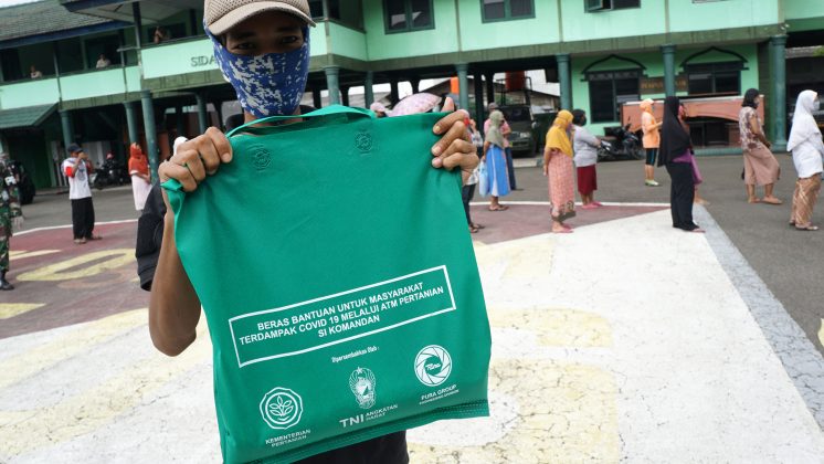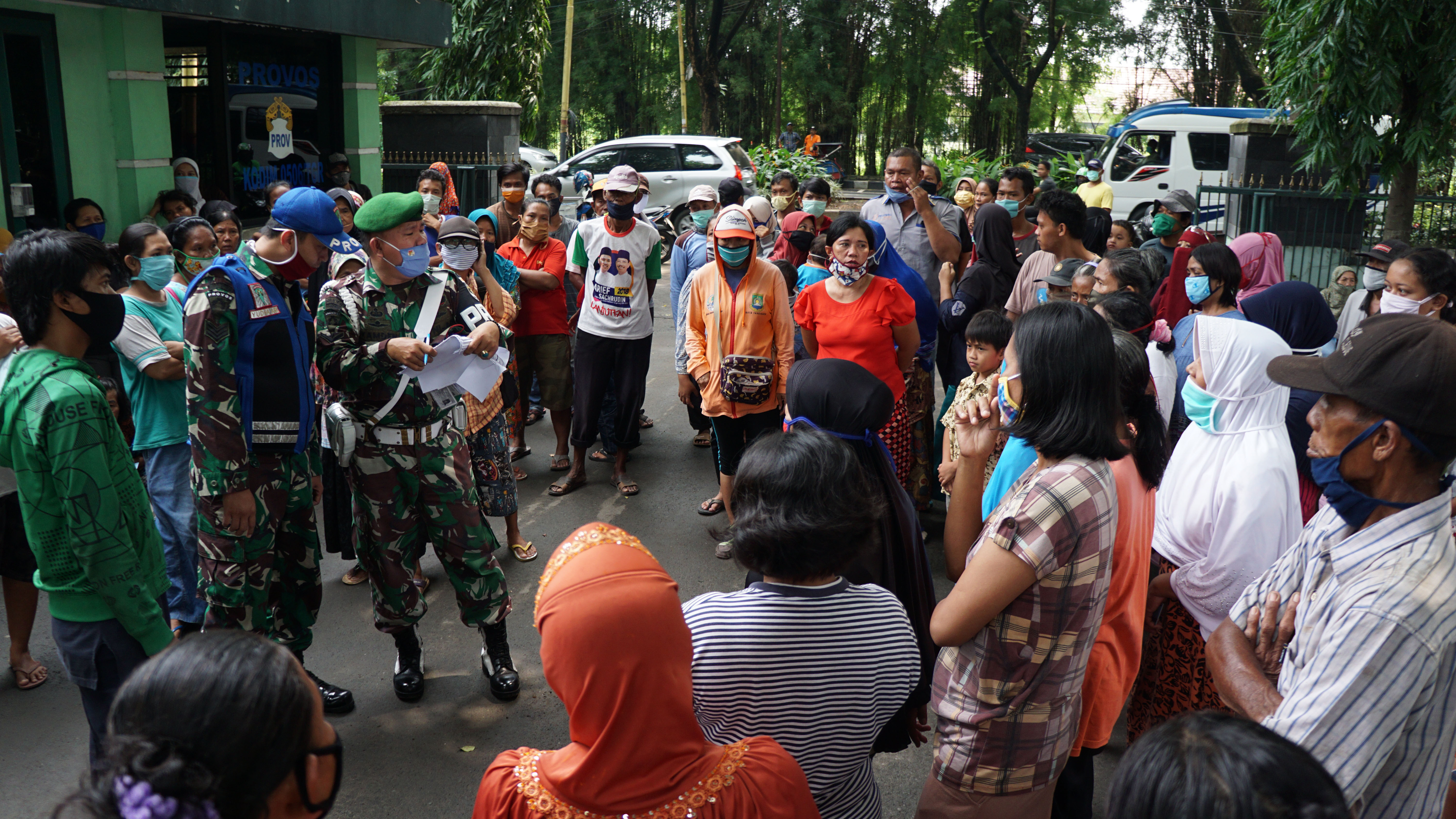 Warga antre mendapatkan bantuan beras dari Kodim 0506/Tangerang, Senin (27/4). Bantuan beras dari Kementerian Pertanian itu sebanyak 17 ton yang dibagikan secara bertahap kepada 1000 warga yang dianggap kurang mampu. FOTO: FAJRIN/KATAKOTA