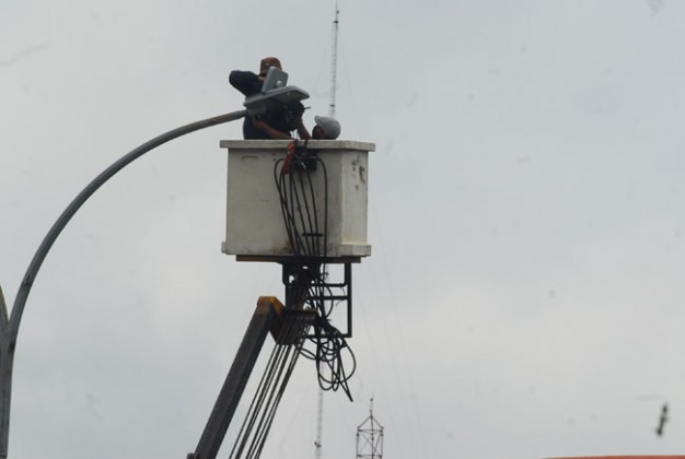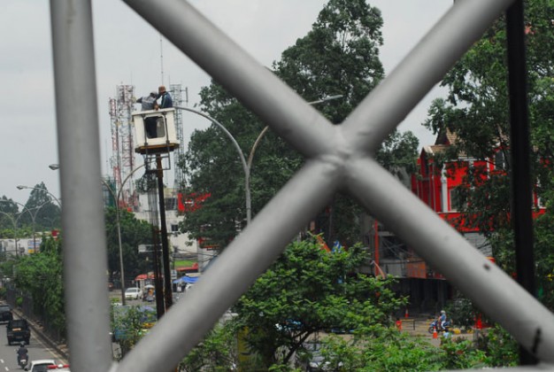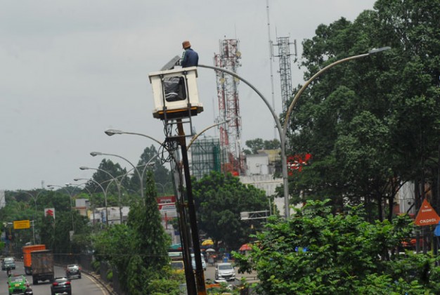 Petugas Dinas Tata Kota Tangerang melakukan pemeriksaan pada lampu penerangan jalan umum (PJU) di jalan MH.Thamrin, Cikokol, Tangerang, Banten, Jumat (22/1). Pemeriksaan dan pemeliharaan PJU itu rutin dilakukan terutama kala memasuki musim hujan, guna mengantisipasi kerusakan. Foto: KataKota/Fajrin