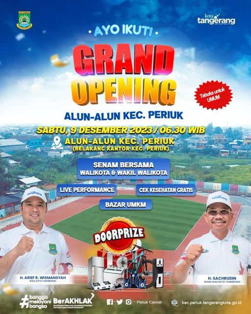 “Total saat ini Kota Tangerang memiliki tiga alun-alun yaitu Alun-Alun Ahmad Yani, Alun-Alun Kecamatan Cibodas, dan terbaru yang besok akan diresmikan adalah Alun-Alun Kecamatan Periuk. Dengan adanya alun-alun di wilayah, perputaran ekonomi juga akan berjalan di mana para pedagang khususnya UMKM akan berjualan. Bagi warga di wilayah pun juga memiliki opsi, bisa ke Alun-Alun di wilayahnya atau ke Alun-Alun Ahmad Yani,” ungkap Sugiharto dalam keterangannya Jumat (08/12/23)