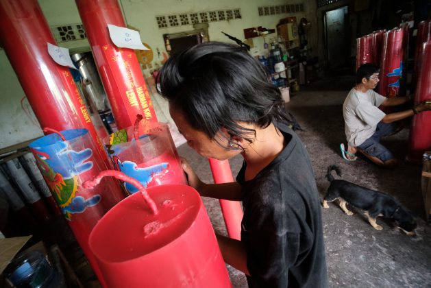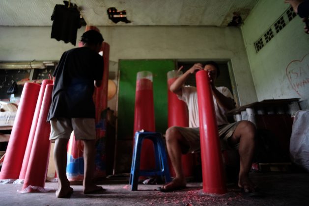 Perajin membuat lilin pesanan untuk perayaan Imlek 2571 di wilayah Karawaci, Kota Tangerang, Selasa (21/1). Menjelang Imlek pesanan lilin meningkat 100 persen dari bulan biasanya. Foto : Fajrin/Katakota