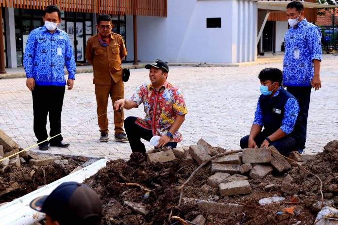 Dalam tinjauannya, Wali Kota melihat fasilitas publik Taman Potret yang berlokasi di Kelurahan Babakan Kecamatan Tangerang yang mengalami tanah amblas tergerus aliran air sehingga kepadatan tanah berkurang.