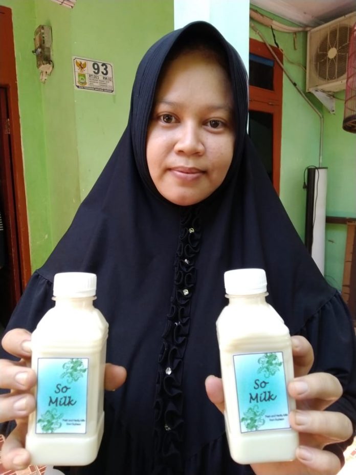“Produksi susu kedelai merupakan inovasi dari kampung tempe jadi dari bahan dasar kacang kedelai tak hanya memproduksi tempe saja tapi olahan lain berupa susu kedelai,” ujar Teti Kusumawati pembuat susu kedelai So Milk.