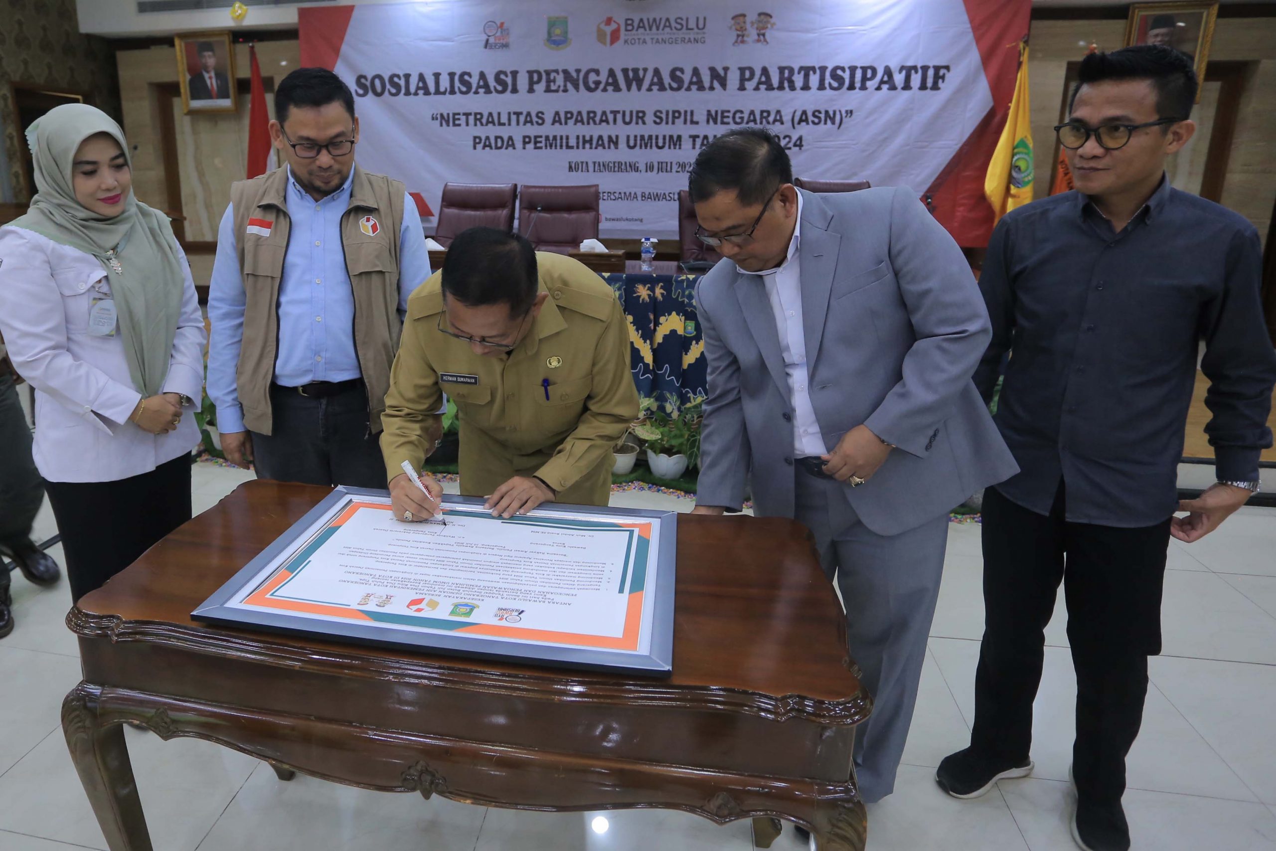 Hal tersebut disampaikan Sekda dalam Kegiatan “Sosialiasi Pengawasan Partisipatif dengan Tema Netralitas ASN dalam Pemilu Tahun 2024” yang diselenggarakan oleh Badan Pengawas Pemilihan Umum (Bawaslu) Kota Tangerang, bertempat di Ruang Akhlakul Karimah, Pusat Pemerintahan Kota (Pemkot) Tangerang, Senin (10/7).