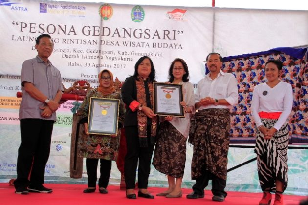 Gubernur DI Yogyakarta, Sri Sultan Hamengkubuwono X (tengah kiri), Bupati Gunung Kidul Badingah (tengah kanan), Head Of Public Relations Division PT Astra International Tbk Riza Deliansyah, dan Ketua Yayasan Pendidikan Astra Michael D. Ruslim Arietta Adrianti berjabat tangan erat yang menjadi simbolis peresmian "Rintisan Desa Wisata Budaya Gedangsari" yang berlokasi di SMKN 2 Gedangsari, Desa Tegalrejo, Kec. Gedangsari, Kab. Gunungkidul, Daerah Istimewa Yogyakarta hari ini (30/8). PT Astra International tbk melalui Yayasan Pendidikan Astra – Michael D. Ruslim (YPA-MDR) menggagas daerah ini untuk menjadi sebuah desa wisata budaya berkolaborasi dengan paguyuban komite sekolah dan masyarakat yang ada di Desa Tegalrejo. (Astra/KataKota/Fajrin)