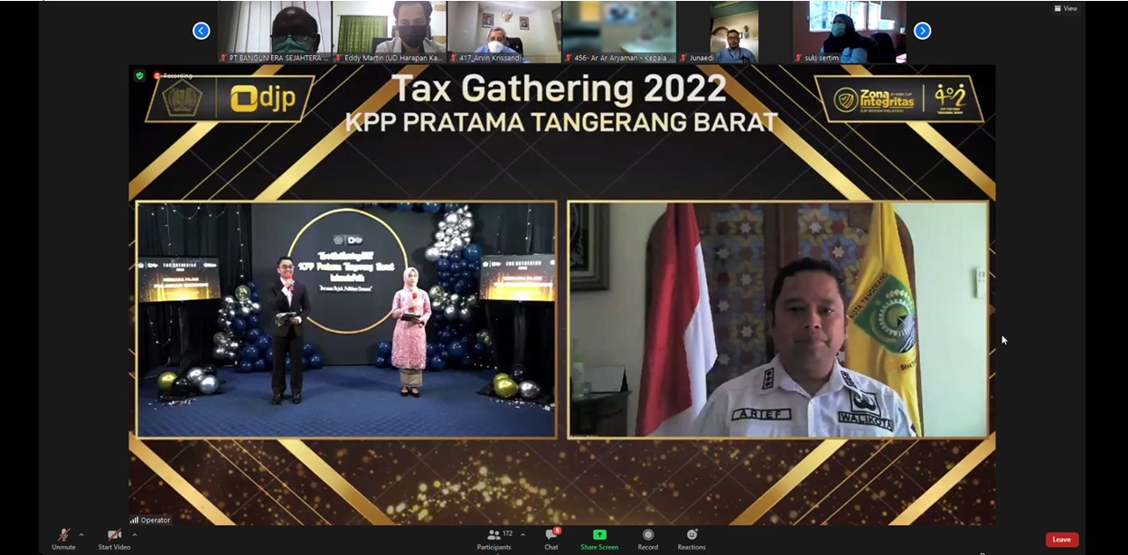 Wali Kota Tangerang H. Arief R. Wismansyah menghadiri kegiatan Tax Gathering yang diadakan oleh KPP Pratama Tangerang Barat bertemakan “Bersama Pajak, Pulihkan Ekonomi” secara daring, Rabu (2/3).