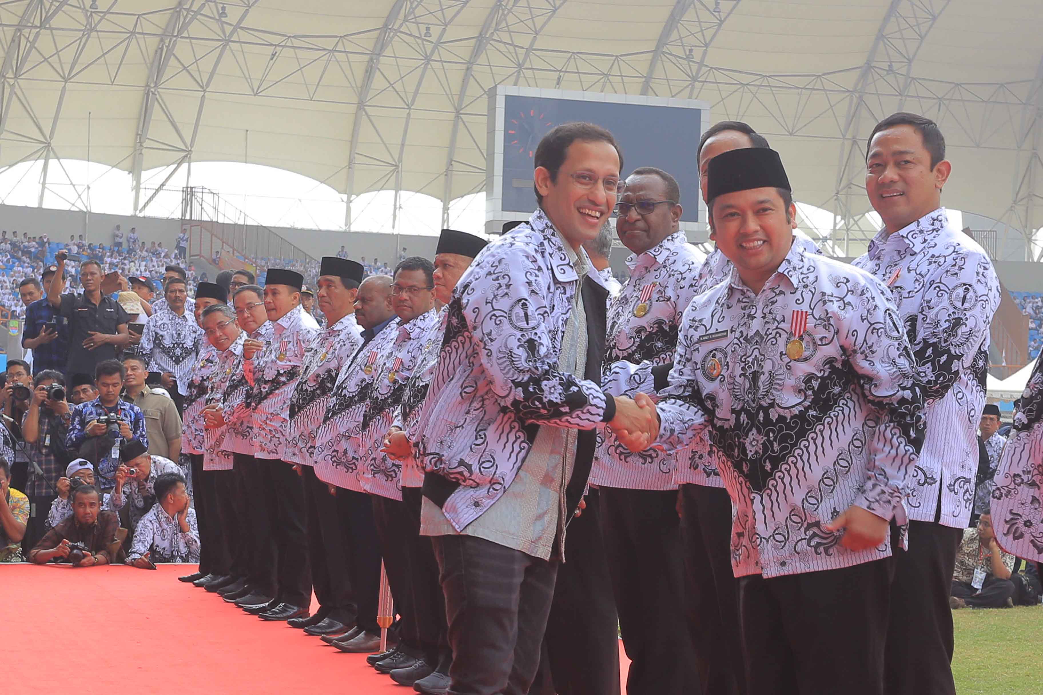 Wali Kota Tangerang Arief R. Wismansyah menerima penghargaan Anugerah Dwija Praja Nugraha dari Kementerian Pendidikan dan Kebudayaan (Kemendikbud) Republik Indonesia dan Pengurus Besar Persatuan Guru Republik Indonesia (PB PGRI) pada acara Puncak Peringatan Hari Ulang Tahun (HUT) Ke-74 Persatuan Guru Republik Indonesia (PGRI) dan Hari Guru Nasional 2019, Sabtu (30/11/19).
