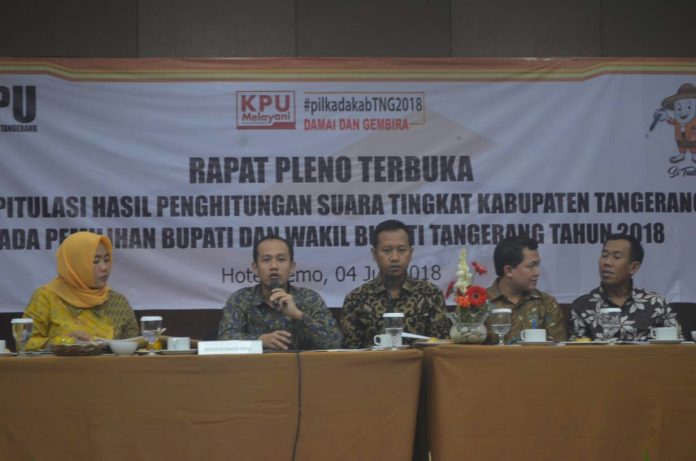 Tangerang, Katakota.com – Hasil rapat pleno terbuka rekapitulasi perhitungan suara Pemilihan Bupati dan Wakil Bupati (Pilbup) Tangerang memperkuat kemenangan pasangan calon (paslon) Bupati dan Wakil Bupati Ahmed Zaki Iskandar-Mad Romli. Pada hasil akhir pleno yang dihelat di salah satu hotel di Kelapa Dua, Kabupaten Tangerang, Rabu (4/7/2018) tersebut, paslon tunggal itu memperoleh suara 83,72 persen.